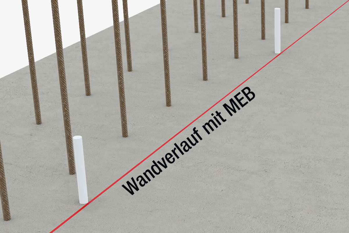Eine Verschalung soll entlang einer definierten Linie positioniert werden? Die Mastertec EdgeBar (MEB) erleichtert Ihnen die Arbeit: Die Rundstäbe aus GFK werden in Bohrlöcher in der Betonplatte gesteckt und bilden einen soliden inneren Anschlag für die Verschalung. Fertig – nach dem Betoniervorgang verbleiben sie einfach als Bestandteil der Wand.